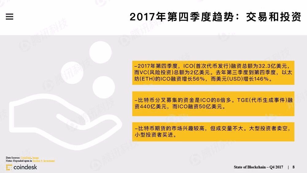 截至2017年第四季度,ICO(首次代币发行)为32.3亿美元,而VC(风险投资)为2亿美元。相比之下,比特币分叉募集的资金是ICO的8倍多。TGE(代币生成事件)融资440亿美元,而ICO融资50亿美元。