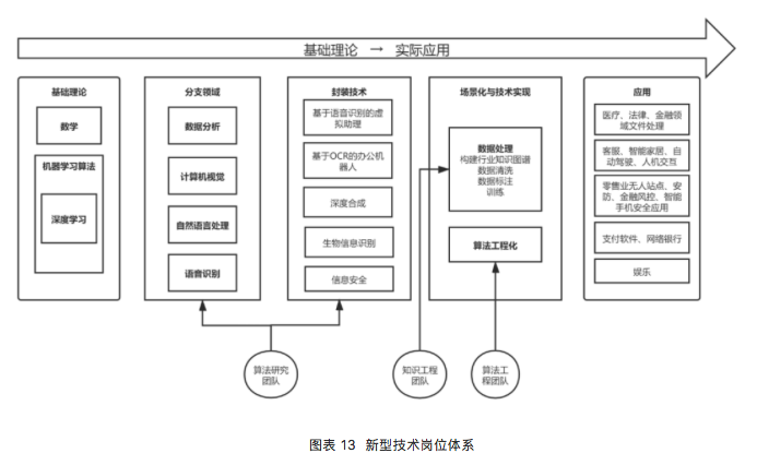 部分成熟型和成长型的人工智能企业需要将人工智能技术应用到多个业务场景,其技术岗位体系采用人工智能算法研究团队和算法工程团队的结构。新型技术岗位体系的特点是同知识工程团队紧密配合。知识工程团队提供不同行业的业务数据并协助建立训练模型,算法研究团队结合应用场景进行算法适配,算法工程团队结合业务场景进行算法实现。面对用户需求时,算法研究团队、知识工程团队与算法工程团队共同探讨解决方案。这类企业接触的客户需求种类多样,针对不同类型的需求由不同团队技术成员负责对接需求与项目交付。
