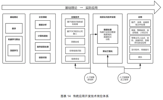 数字化转型的传统企业在寻求通过人工智能技术降低运营成本、提升工作效率、改善产品与服务质量时,通常选择设立研发部门或子公司,但在技术岗位体系的设置上受企业自身组织架构影响,算法研发岗位的职能同样繁杂,可能涉及人工智能封装技术、行业场景适配与应用开发等多个方面。