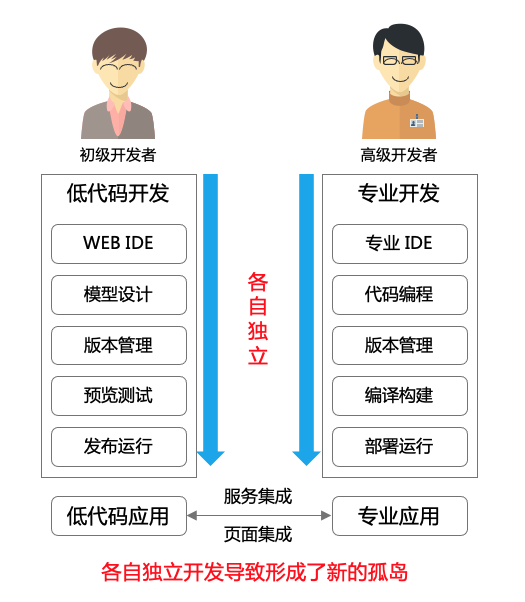 在一个项目团队中分为两拨人,一拨人技术水平不需要很高,熟练的掌握低代码开发工具;另一拨人是开发人员,用熟悉的专业工具写着专业代码,弥补低代码不足的部分。这两拨人用着完全不同的工具,不同的技术栈,只是用一些技术手段来让两者的产物可以“混合”在一起,低代码和专业代码完全是两张皮。