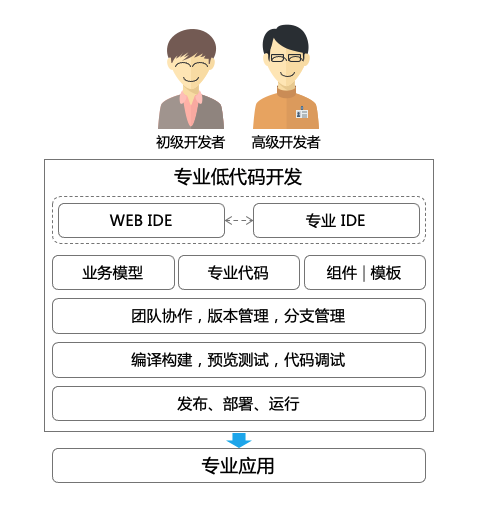 而最终产生的应用,虽然是低代码结合专业代码开发的,但是由于低代码模型会编译输出专业代码,所以最终交付的应用本质上就是专业代码编译构建出来的专业应用。